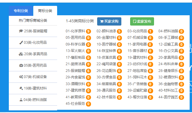 2.在首頁(yè)的左上方有專(zhuān)利的分類(lèi)跟商標(biāo)分類(lèi),可以直接根據(jù)分類(lèi),按類(lèi)別快速查找,如下圖: