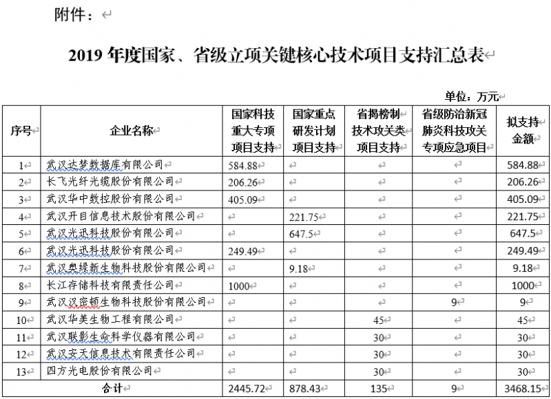 武漢東湖新技術開發區關于2019年度國家、省級立項關鍵核心技術項目支持結果的公示