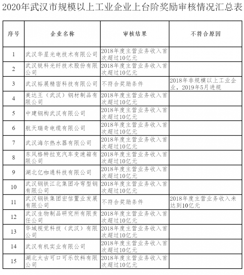 附表:《2020年武漢市規模以上工業企業上臺階獎勵審核情況匯總表》
