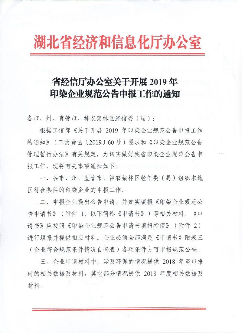 省經信廳辦公室關于開展2019年印染企業規范公告申報工作的通知